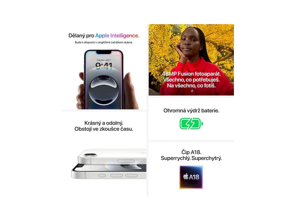iPhone 16e má po všetkých stránkach parádny dizajn. Predáva sa v elegantnom čiernom alebo bielom prevedení. Plášť iPhone 16e z leteckého hliníka je konštruovaný tak, aby niečo vydržal a ustál všetky nástrahy každodenného života.